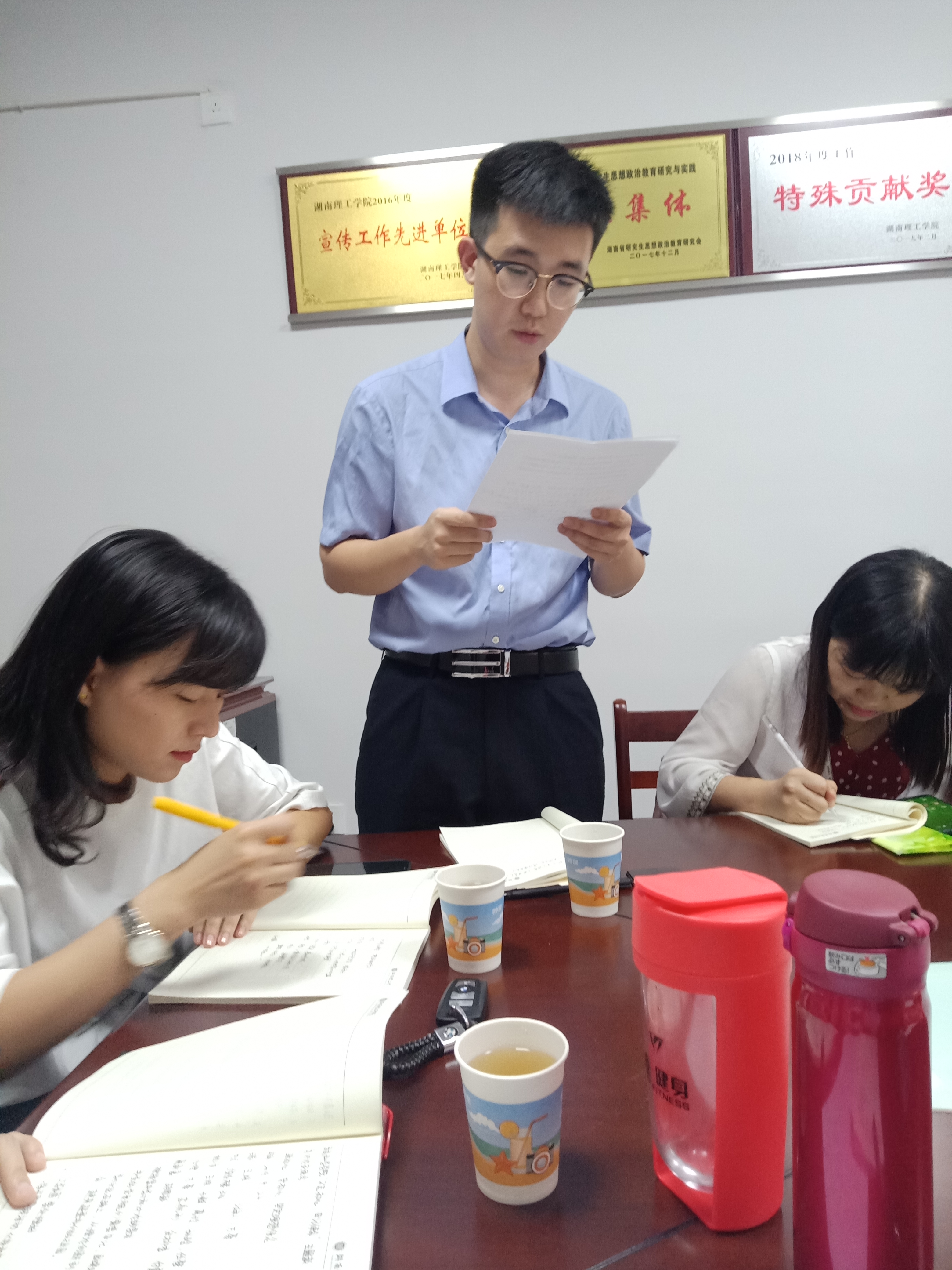按照学校党委及学院党总支“不忘初心、牢记使命”主题教育的统一部署,支部负责人组织研究生党员认真学习习近平总书记在“不忘初心、牢记使命”主题教育工作会议上的讲话精神。会上,全体党员重温入党誓词。随后,研究生党员结合自己的工作和学习实际,畅谈各自的学习收获和体会,并就自己该如何“牢记党的宗旨,增强服务意识”提出了的努力方向。大家纷纷表示,明确党员身份,对自己高标准严要求,努力提升服务意识,在工作中积极践行“干事”精神,发挥螺丝钉和领头雁的作用。最后,王炜指出,作为一名党员,要时刻牢记使命,强化服务意识,克服工学矛盾,全面贯彻落实主题教育的各项要求。(撰稿:王群)
