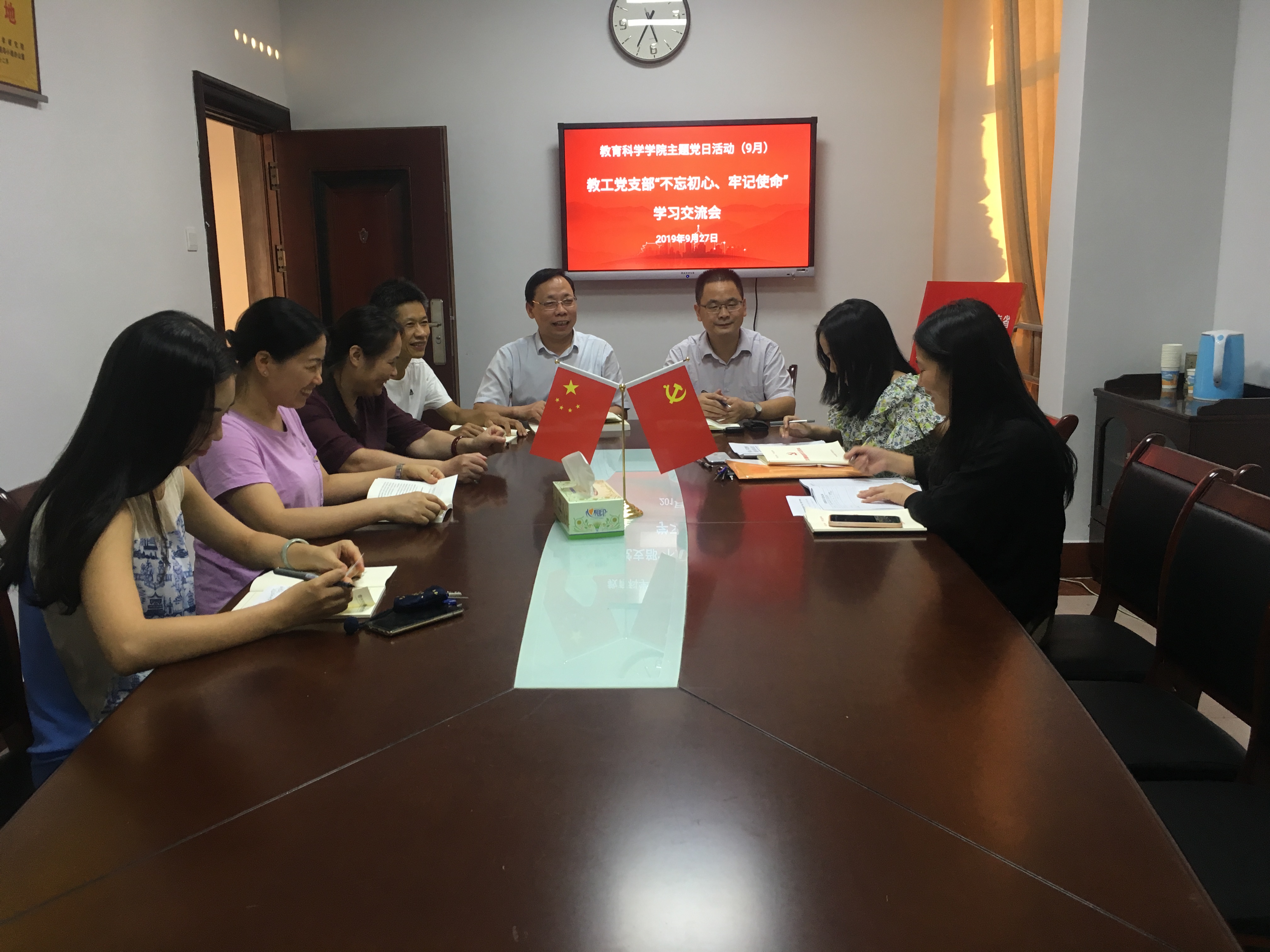 根据中央、省委关于“不忘初心、牢记使命”主题教育文件精神和《湖南理工学院“不忘初心、牢记使命”主题教育实施方案》安排,9月27日下午,教育科学学院教师党支部在综合楼314室举行主题党日活动,召开“不忘初心、牢记使命”主题教育学习交流会。学院教师党支部副书记刘青姗主持主题党日活动,学院全体教工党员参加。