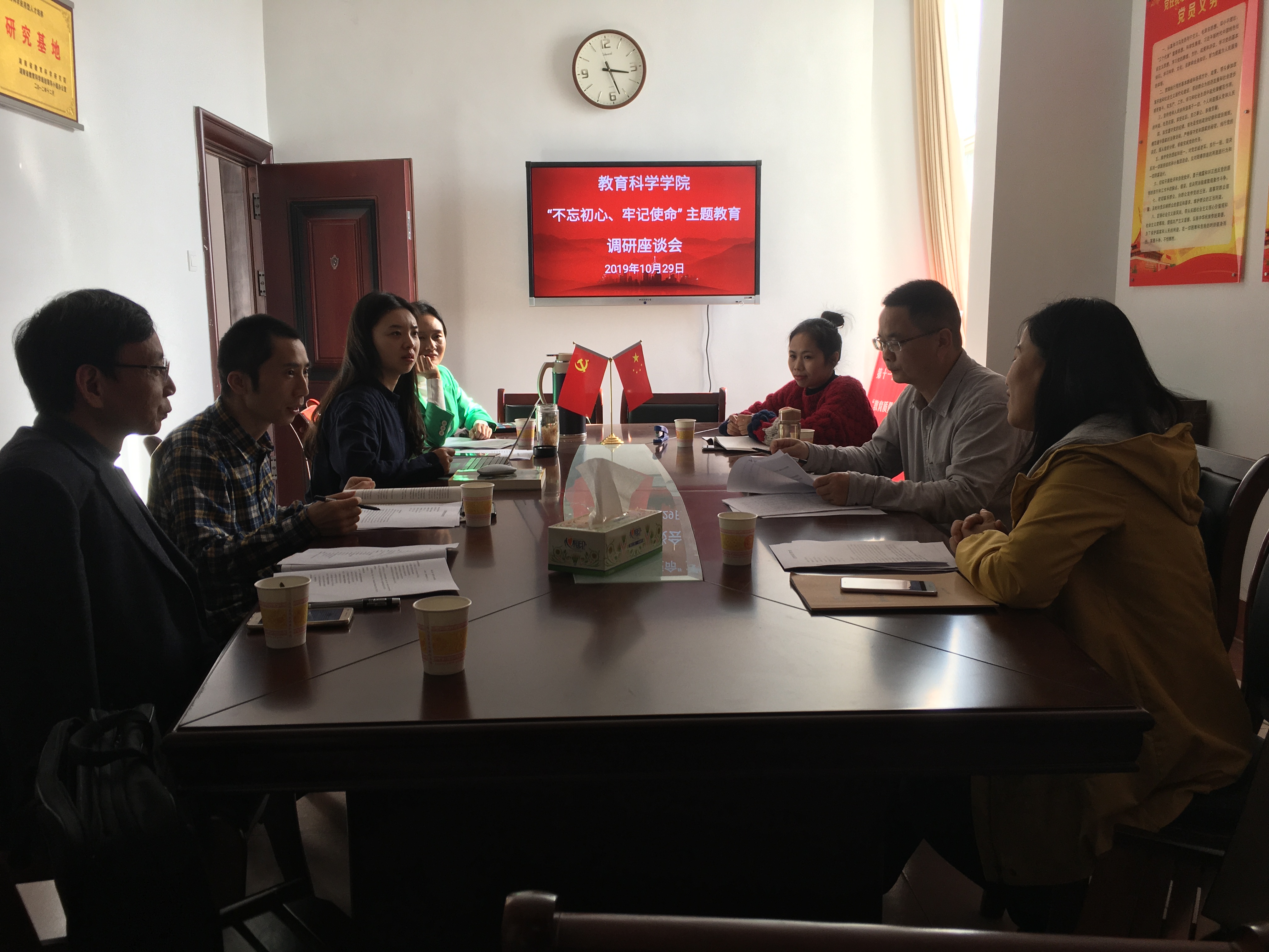 为进一步推进“不忘初心、牢记使命”主题教育,扎实做好调查研究,在前期调研基础上,教育科学学院党总支于10月29日下午在综合楼314会议室举行调研座谈会,听取意见、检视问题。学院教学一线教师和行管线教师代表参加调研座谈;座谈会由学院党总支负责人主持。