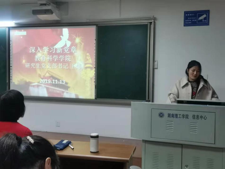 11月13日下午,教育科学学院“不忘初心、牢记使命”主题教育党课在12教学楼12405教室举行。党课由学院研究生党支部书记王炜同志主讲,2019级教育管理专业全体研究生党员参加。