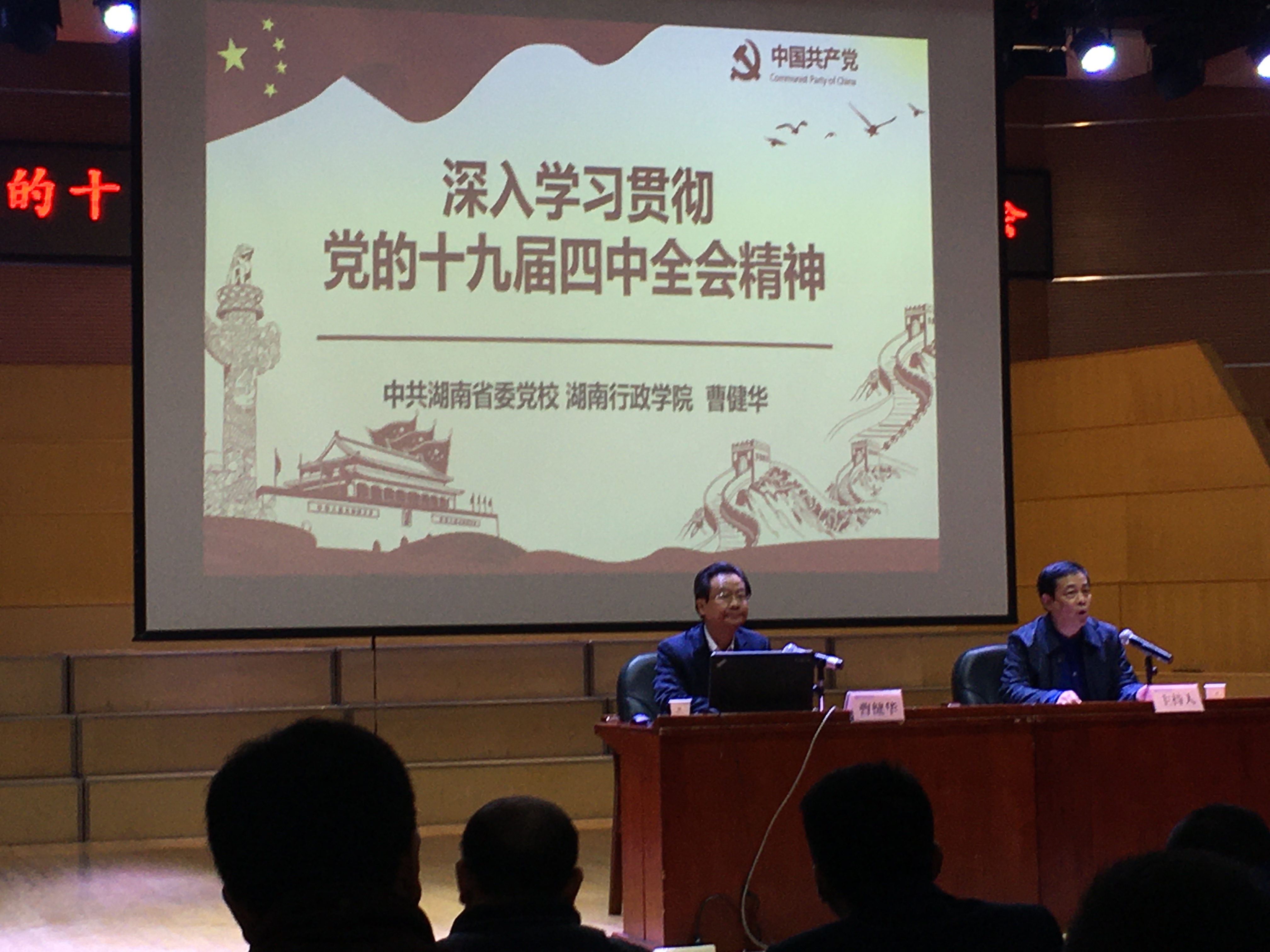 11月28日(星期四)下午3时30分,学习贯彻党的十九届四中全会精神省委宣讲团报告会在音乐厅举行。省委宣讲团成员、中共湖南省委党校湖南行政学院副校(院)长曹健华作宣讲报告。教育科学学院刘理、刘淳松、彭阳红等班子成员及学校咨询专员王岳斌等参加学习。