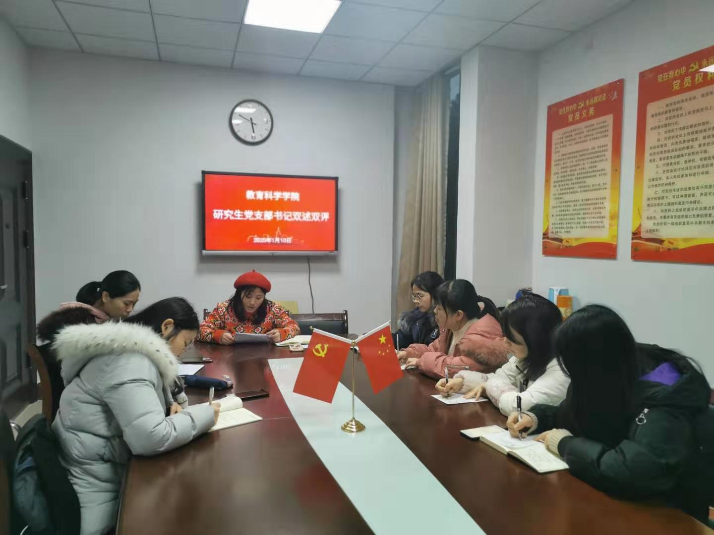 1月10日,教育科学学院研究生党支部在综合楼314开展研究生党支部书记双述双评会议。研究生党支部书记王炜和全体党员参加此次会议。