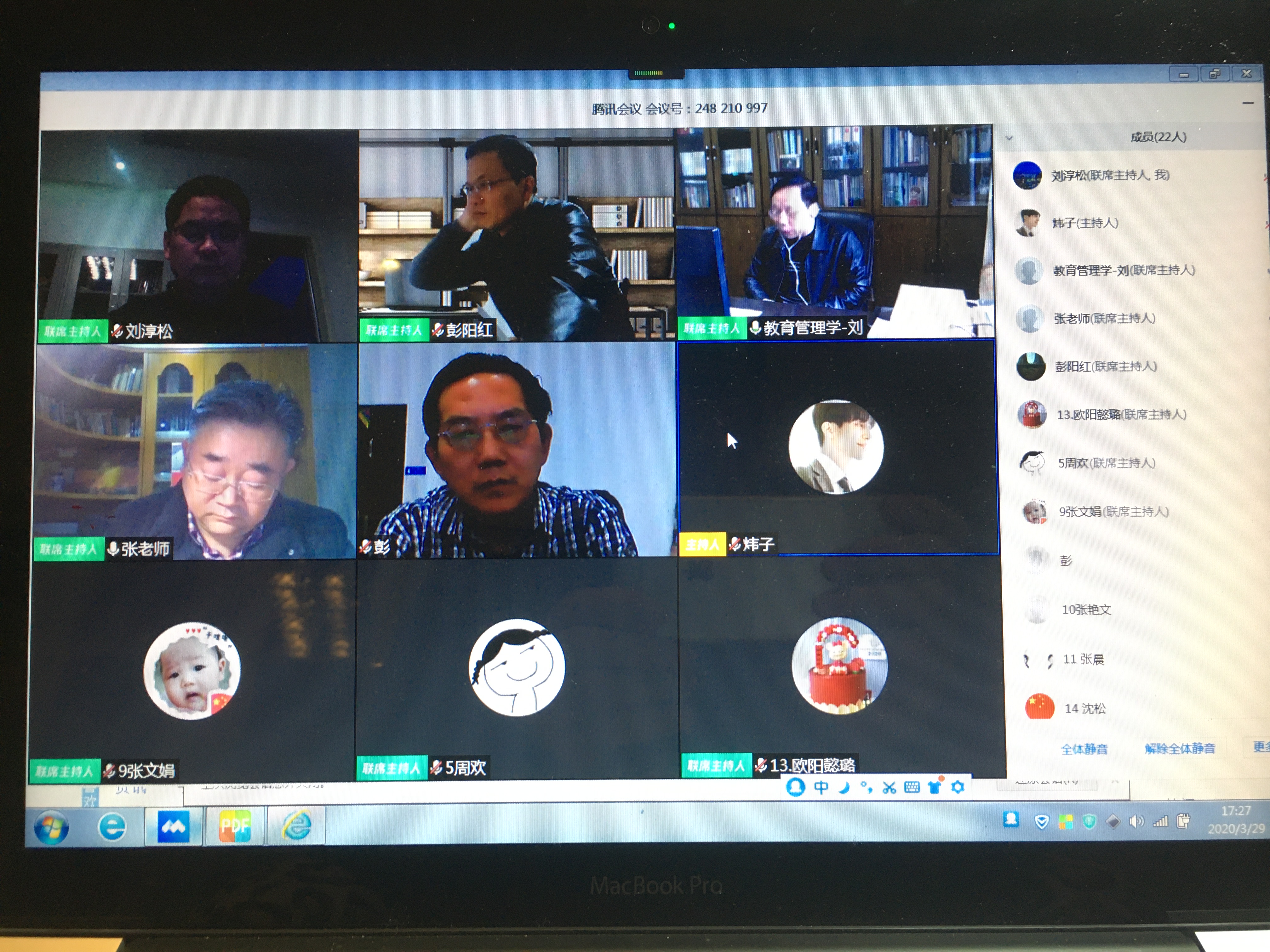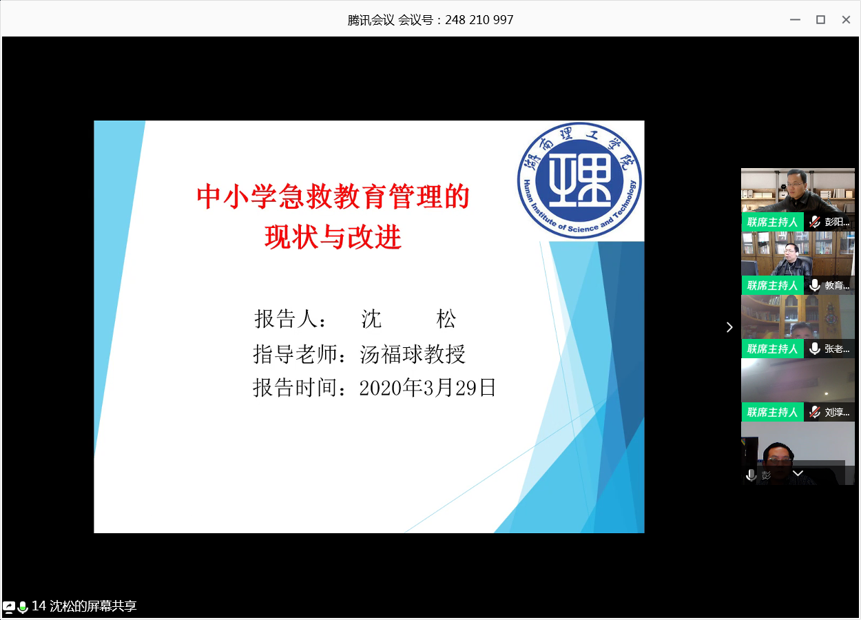 3月29日,教育科学学院通过腾讯会议APP以视频连线方式举行2020届教育管理专业硕士研究生学位论文“云端”预答辩。教育管理专业研究生导师、校党委书记李明云端在线指导答辩。答辩专家委员会由教科院院长刘理、期刊社社长彭柏林、教科院党总支书记刘淳松、岳阳市教育科学与技术研究院中小学正高级教师张金华、教科院副院长彭阳红组成。研究生院党总支书记李丽荣、研究生导师代表王岳斌、研究生院老师黄红霞等在线观摩、指导。答辩秘书王炜利用视频系统进行全程录像录音。