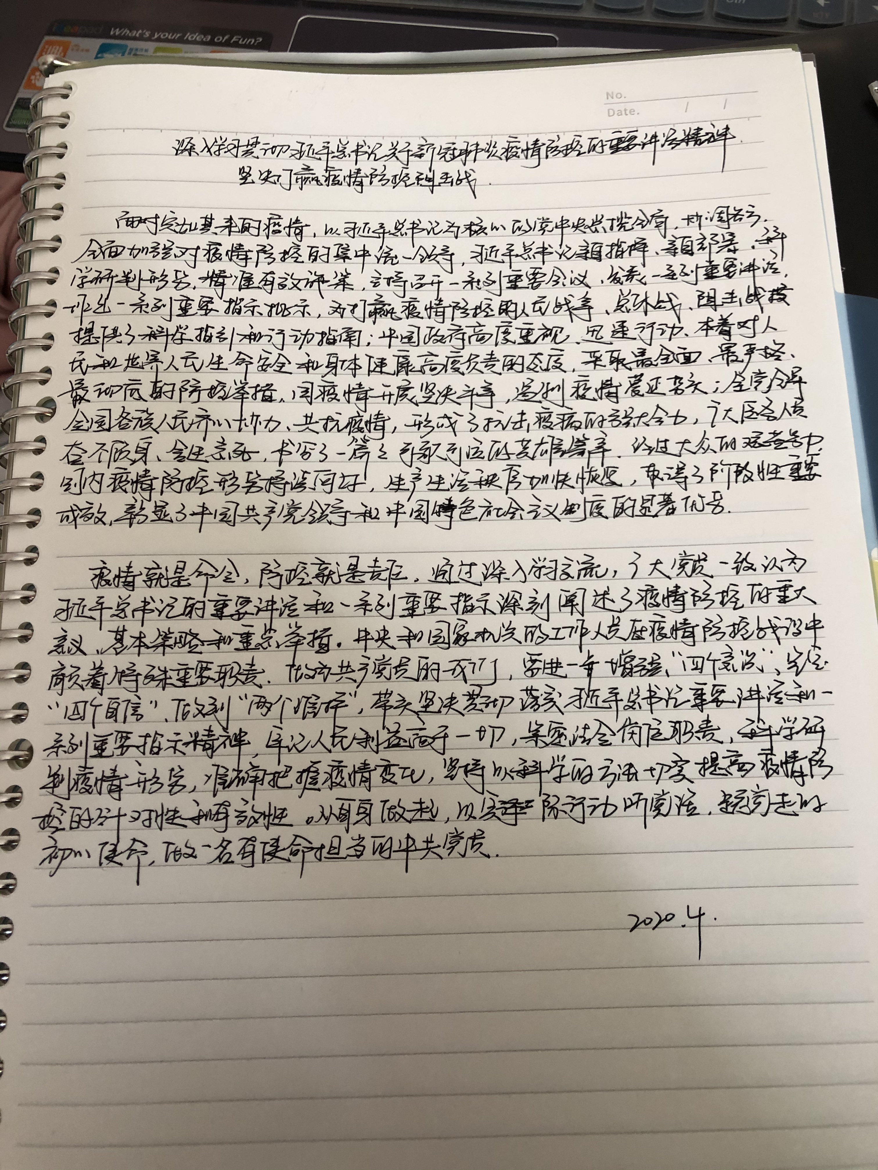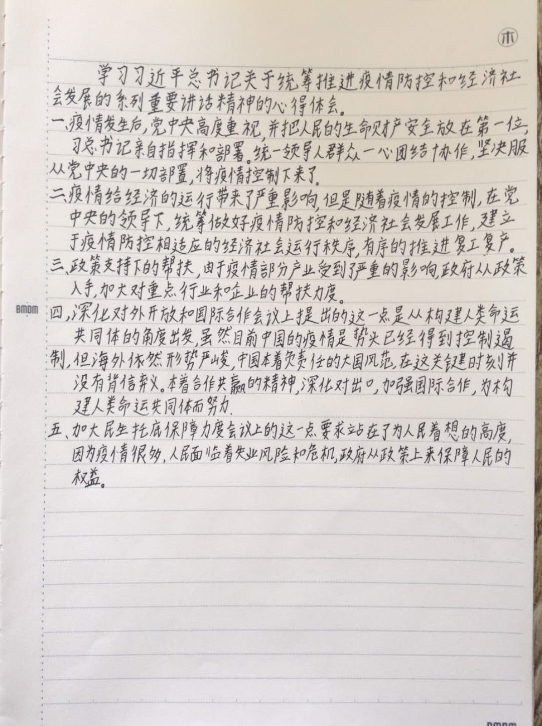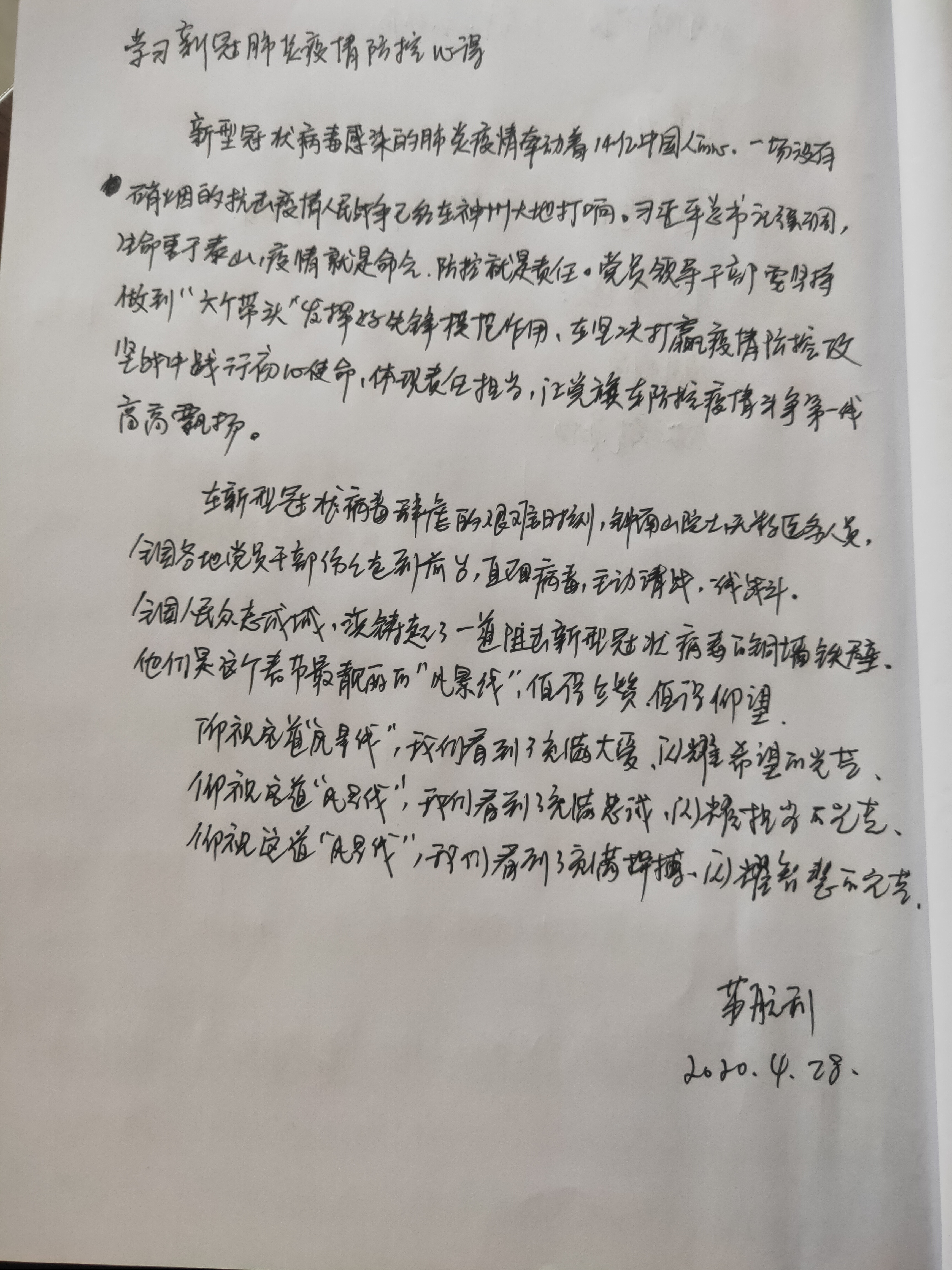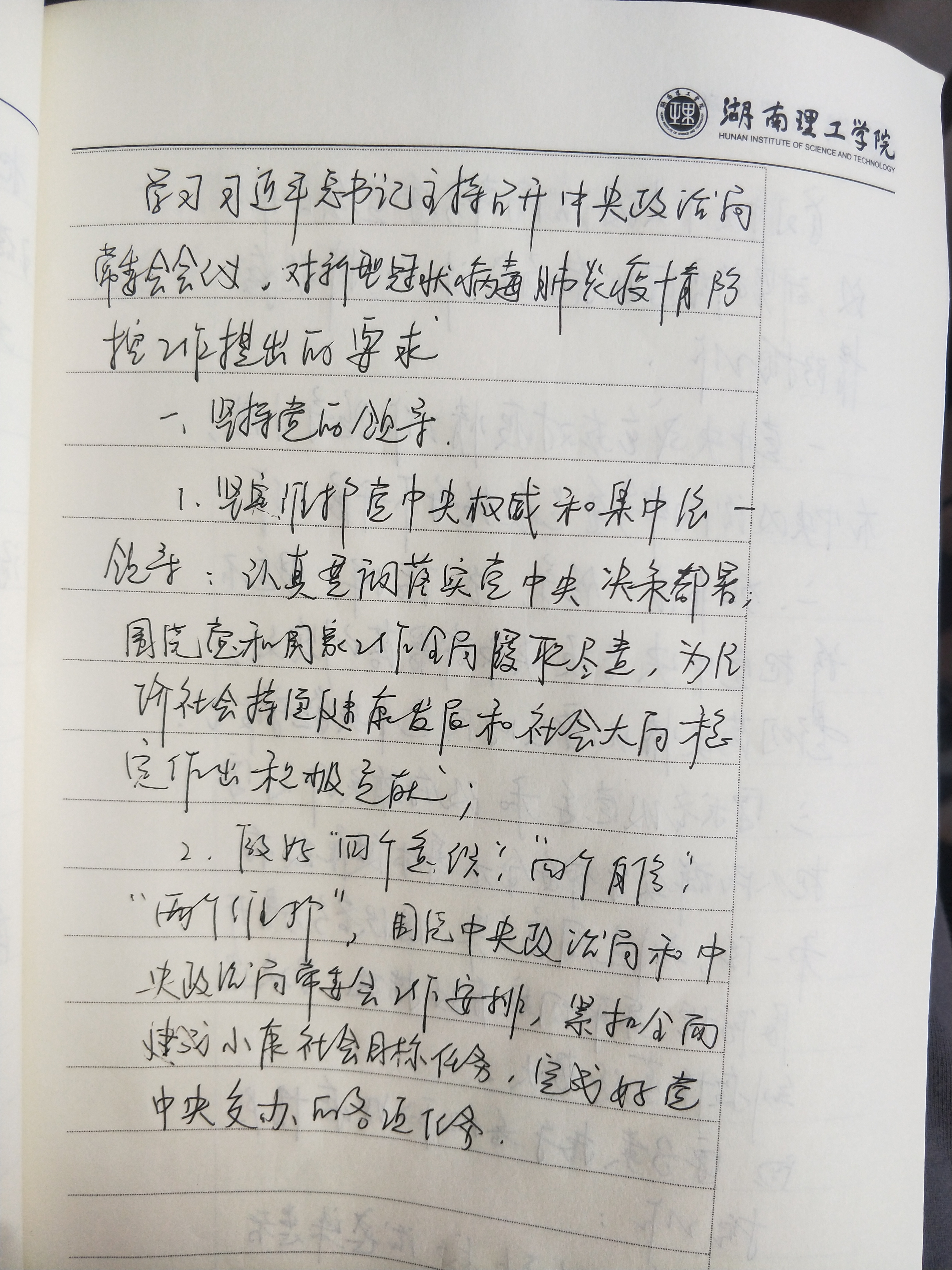 全体研究生党员认真学习习近平总书记关于统筹推进疫情防控和经济社会发展的系列重要讲话精神、学习中央和省委关于推进复工复产等方面的政策措施等,并认真做好学习笔记,同时撰写了学习心得和体会。鉴于当前仍处于疫情防控期,本次主题党日活动由支部书记组织,全体党员以分散学习、撰写学习笔记、交流心得等方式进行。((撰稿人:付霞)