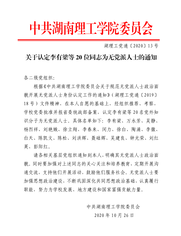 近日,学校党委发文,教育科学学院副院长彭阳红被认定为无党派人士。无党派人士是在本人自愿的基础上,经组织推荐、考察,校党委批准并报省委统战部备案。此次,我校认定20名同志为无党派人士。