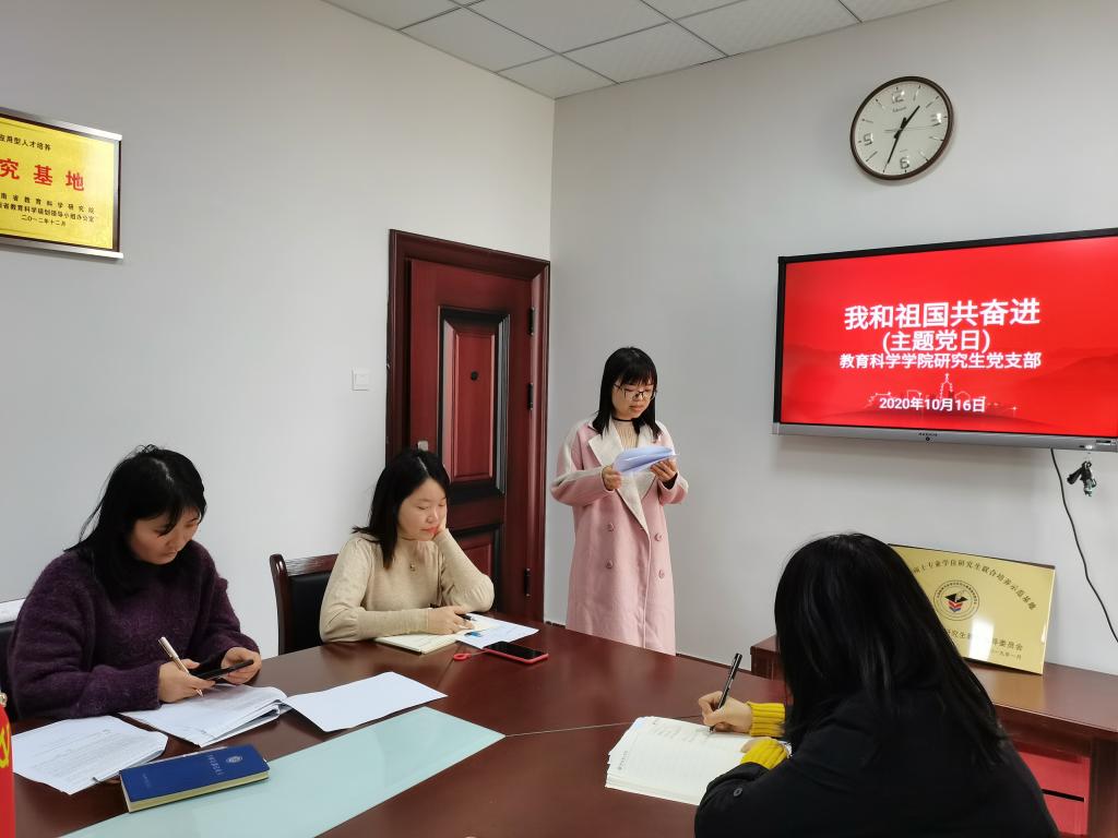 根据校党委组织部的指示精神和学院党总支会议要求,教育科学学院研究生党支部于10月16日在综合楼314会议室开展“我和祖国共奋进”主题党日活动。研究生党支部书记王炜和全体研究生党员参加。