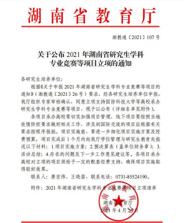 近日,湖南省教育厅公布2021年湖南省研究生学科专业竞赛等项目立项名单,由我院刘理教授主持申报的项目“教育高质量发展与教育评价改革”获批湖南省研究生“暑期学校”立项。