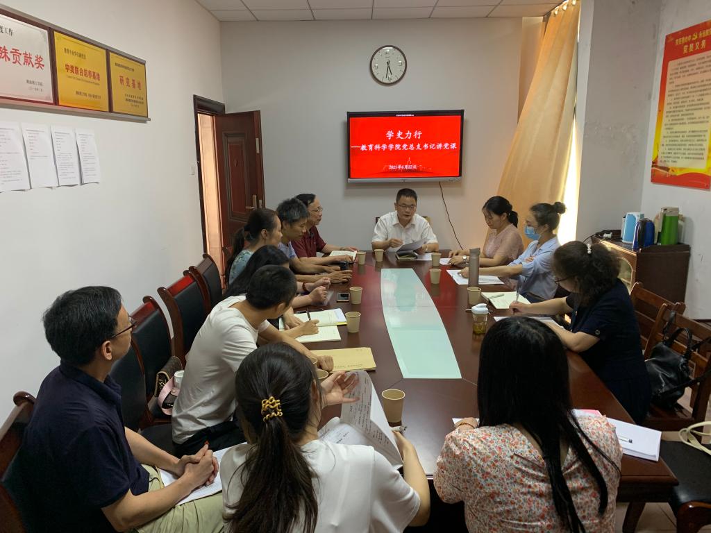 6月22日下午,教育科学学院党总支理论学习中心组(扩大)学习在综合楼314会议室进行。学院党总支书记、党史学习教育领导小组组长刘淳松教授主讲党课,学院全体中共党员和党外教师参加学习。