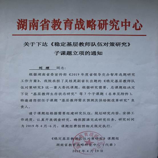 近日,湖南省教育发展战略中心发来函件,委托我院院长刘理教授承担《基层教师需求预测及供给侧改革研究》课题,该课题系由湖南省教育发展战略中心承担的吴挂英副省长出题的《稳定基层教师队伍对策研究》重大委托课题子课题。(刘青姗)